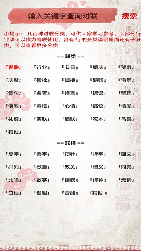 (五) 收集了几百种分类的经典对联,每条都分好类型了,收集了上万条祝福语,过节祝福的好帮手 软件功能