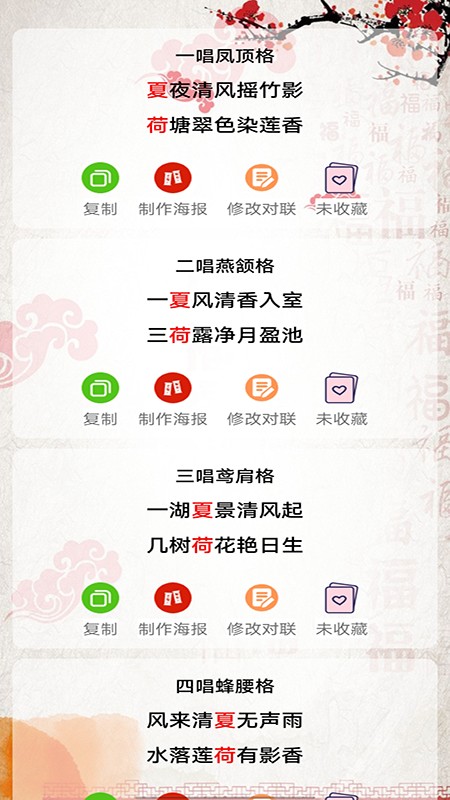 对联大全软件具备定期更新的特点,拥有众多实用功能。支持嵌字联创作,可根据用户需求将特定的字嵌入对联中。能够实现上联对下联、下联对上联并搭配横批,为用户提供对联匹配和完善的服务。具备藏头、藏中、藏尾对联以及关键字对联的生成功能,满足多样化的创作需求。还收集了辞赋、元曲、现代诗、古词大全,丰富用户的文学资源。此外,软件收集了几百种分类的经典对联,且每条都分好了类型,同时还收集了上万条祝福语,是过节祝福的好帮手。