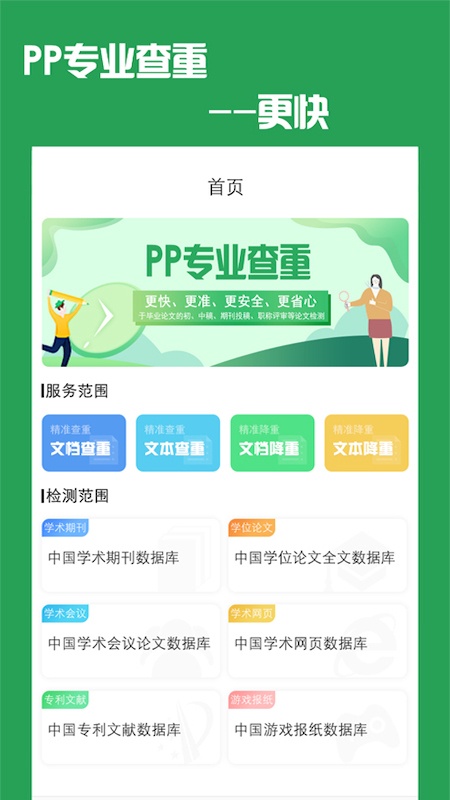 专业的论文查重检测助手,提供良好的论文查重及论文检测服务,软件拥有海量的对比数据库,覆盖十多种学术文献类型,查重过程安全性强、保密性好,检测结果正确率高。无论是毕业论文、学术论文、知网论文都可通过PP论文查重软件进行检测查重,有效提高毕业论文的通过率。 软件特点