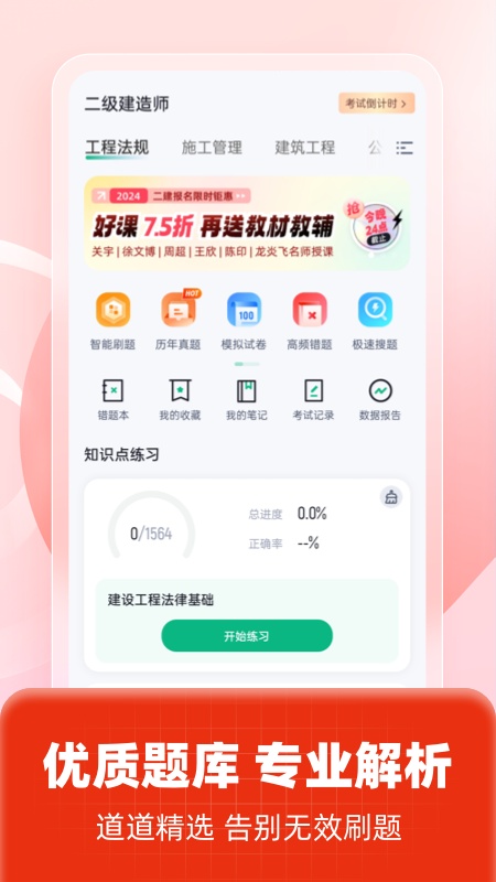 二级建造师题库内含考点练习,全国通用卷以及地区卷模拟练习,以及按照固定考试比重的随机式的抽题的真题考场,成绩单实时记录考试数据,一点一滴的反馈考生近期学习状态以及自我正确率的提升,大大的给予考生通过考试的信心。 APP功能