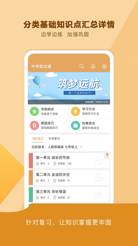 学生可在同步练习板块选择对应初中政治人教版教材版本和年级的试题进行练习,系统会自动记录练习进度。打开首页就能看到中考倒计时,时刻了解时间。在发现页能学习中考政治专题、方法技巧和时事政治。知识点板块可按教材目录查看详细知识点。试卷板块可选择各省市中考真题练习并查看解析。中考复习板块做专题练习,每道题都有讲解。文章板块可阅读各类备考文章。试题练习时,真题和模拟题的错题会自动分析。遇到重要的知识、题目、文章可进行收藏。