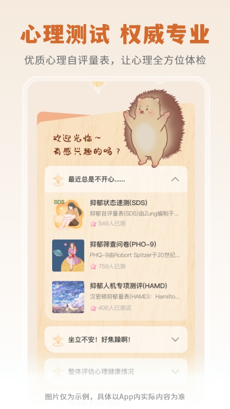 提供专业的心理健康测试和专业的测试分析报告,包含情感测试、抑郁焦虑测试、职业性格测试、家庭婚姻测试、子女教育测试、人际关系测试、MBTI、PHQ9、SCL90、SDS、SAS等百余个心理测评量表,你可以任选量表进行测评,全面了解自身心理健康状况。