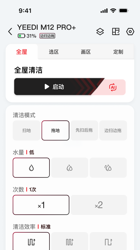 • 清洁参数实时调整:机器人吸力、水量等自定义设置,满足不同的清洁需求;