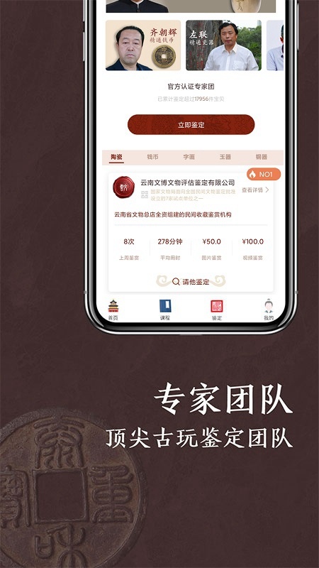 提供玉器珠宝、紫砂陶瓷、文玩杂项、书画篆刻、工艺作品和钱币铜器六大品类的古玩鉴定服务。用户可通过手机随时拍照上传进行鉴定,还能自己选择鉴宝专家,实时接收专家鉴定意见。平台有资深鉴别团队,为用户收藏之路保驾护航。此外,每天有古董鉴定大师分享独家知识、鉴定要领、鉴赏诀窍、搭配经验,还有多种专家热门古玩课程可供免费试看。