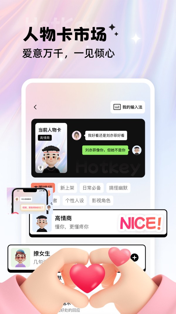 聊天人设市场提供海量聊天人设,涵盖恋爱话术等丰富内容,让你迅速打破尴尬。恋爱开场白功能更是独特,为你的恋爱回复提供绝佳思路,让你毫不犹豫地 Say hi,轻松拉近关系。还有聊天亲密度设置以及恋爱键盘的贴心设计,助你掌控聊天的分寸,无论是面对陌生人还是灵魂伴侣,都能应对自如。