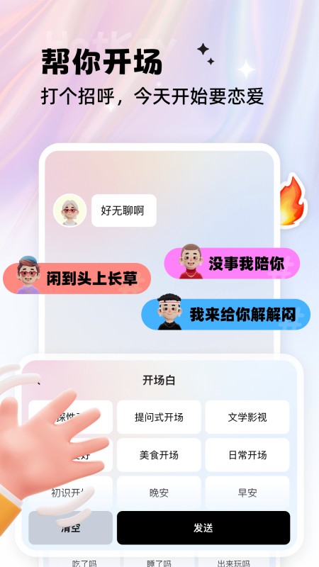 • 打破冰霜,让陌生人感觉更舒适,使用恋爱开场白功能