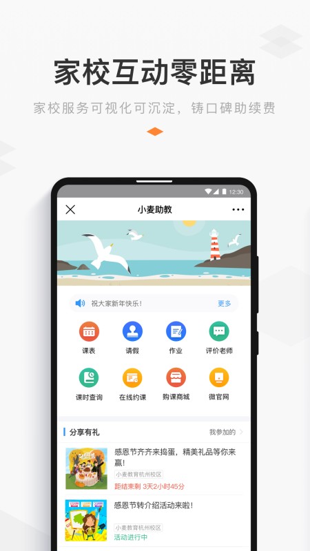家校互动:在线发通知,为学员建专属成长档案可分享朋友圈,还有课后评价、线上作业等实时互动。