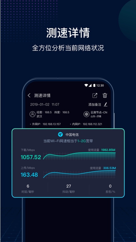 【一键测速】一键精准测试Wi-Fi、4G、5G和宽带速度,提供下载速度、上传速度、延时、丢包、抖动数据 ;