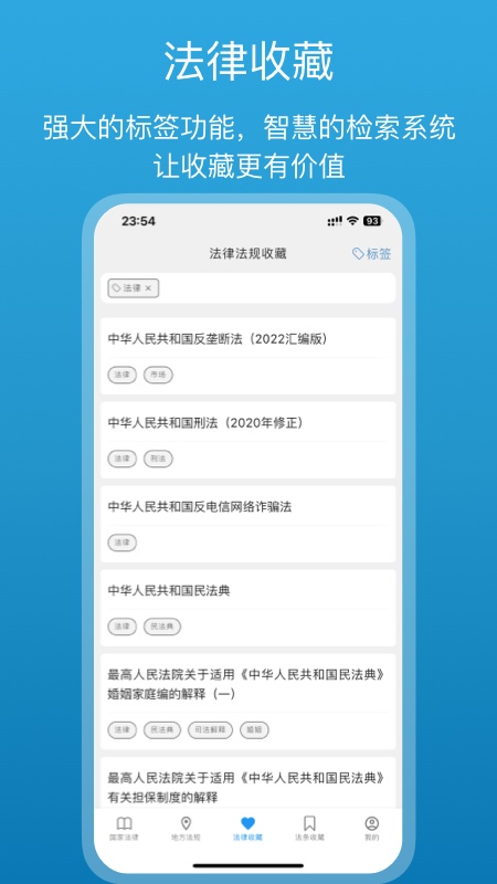 • 强大的收藏:收藏法律、收藏法条;支持标签管理收藏;收藏的搜索功能