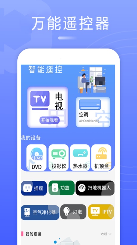 智能电视遥控器可以一键遥控电视,空调,DVD,机顶盒,投影仪,热水器,插座,音响,扫地机器人,空气净化器,灯泡,IPTV等各种智能家电设备。