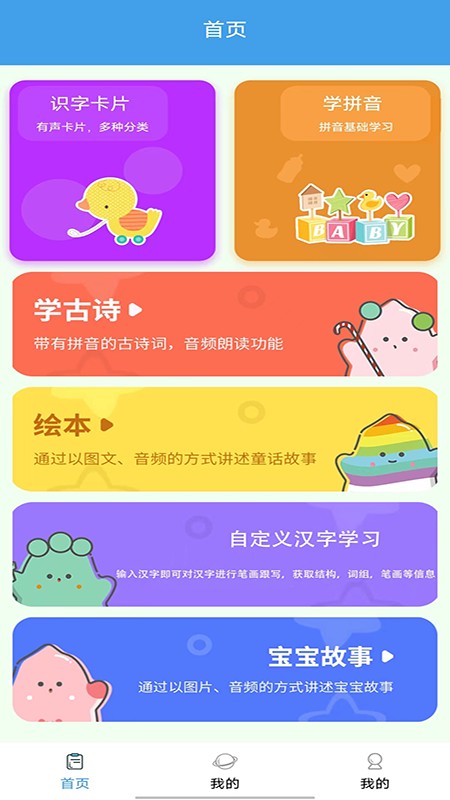 幼儿识字软件采用看图识字的方式带领宝宝学习汉字,包含生动的识字卡片、中英文对照、古诗、声母韵母的教学、绘本小故事等丰富内容,
