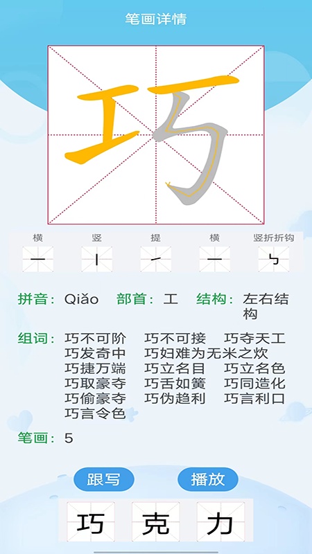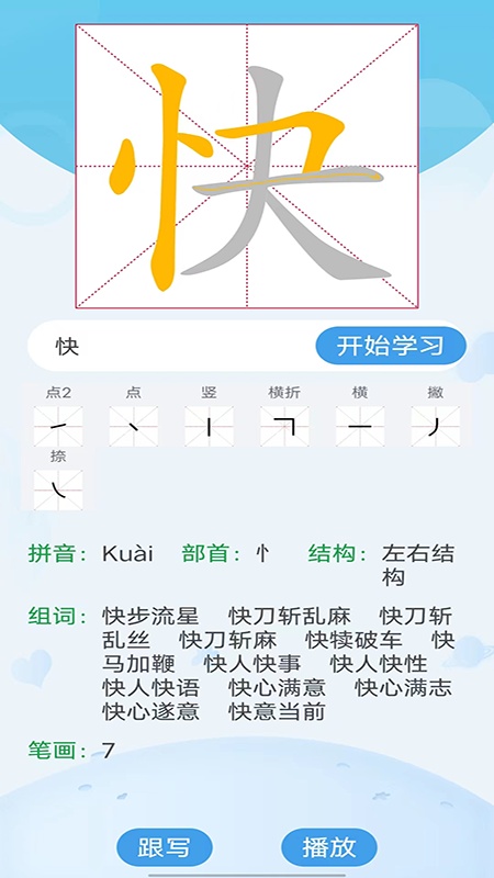 5:自定义学习汉字模块: 输入汉字即可让孩子轻松学习该汉字的笔画和词组,结构等信息,是孩子学习汉字的好帮手。 应用功能