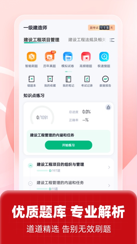 该APP题库涵盖一级建造师考试大纲范围,有历年真题及模拟试题题型,试题能全真模拟真实考试。新增搜题功能,支持语音和拍照搜题,可解决一级建造师考试中的疑问。还新增模拟考试功能,考生可按自我练习的考点选择对应模拟试卷,也能选择搭配好的模拟整卷考试。此外,题库内有考点练习、全国通用卷以及地区卷模拟练习,还有按固定考试比重随机抽题的真题考场,成绩单可实时记录考试数据。