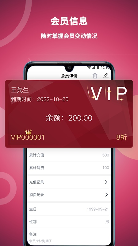 【会员管理】:会员姓名、电话、折扣、生日等全面的信息录入。