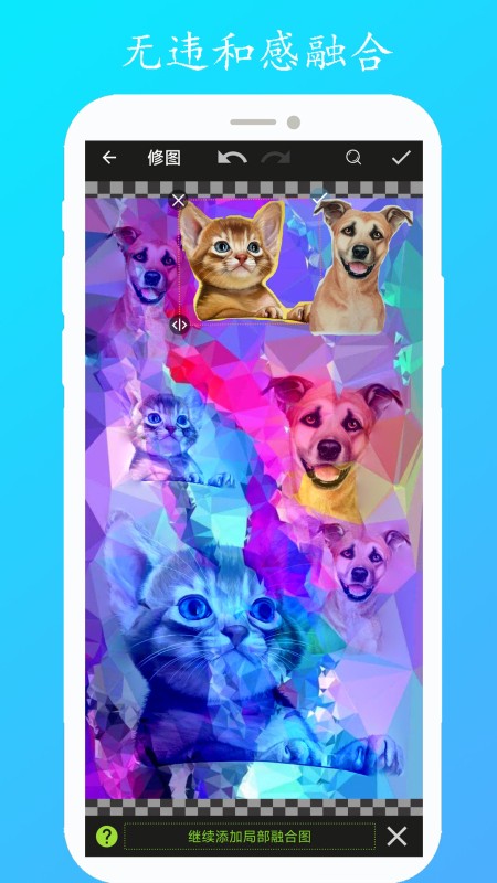 融合功能可实现图片叠加融合,融合图会根据背景图的色彩进行无违和感融合。