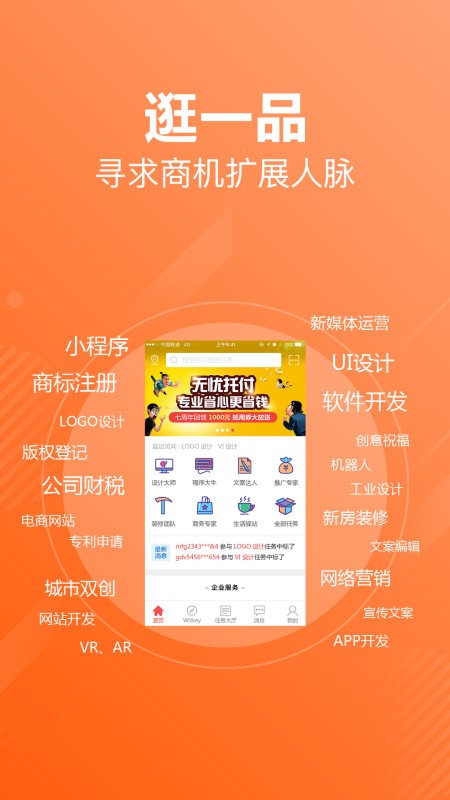 威客可在一品威客轻松接外包,做任务,平台提供设计、开发、文案、装修、营销等多重分类任务,包括LOGO设计、装修设计、程序开发、游戏开发、APP开发、网络营销、网络推广、文案策划等。