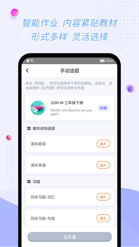【布置作业】:随时随地布置作业练习,学习资源包含课本、单词、习题、试卷等,内容紧贴教材,形式丰富多样,老师可以自主灵活选择,满足教学需求。