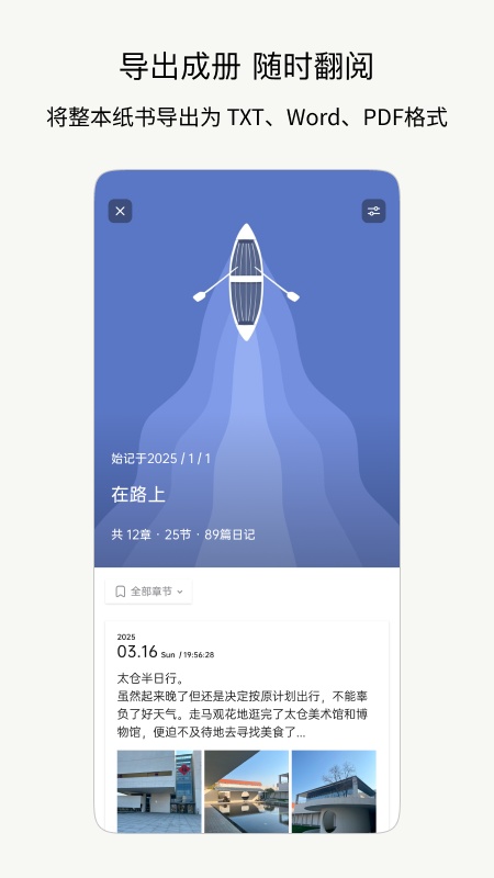 【纸书】可把生活写成一本书,将日记收录进不同的纸书/章/节,还支持整本纸书导出,方便打印成册。