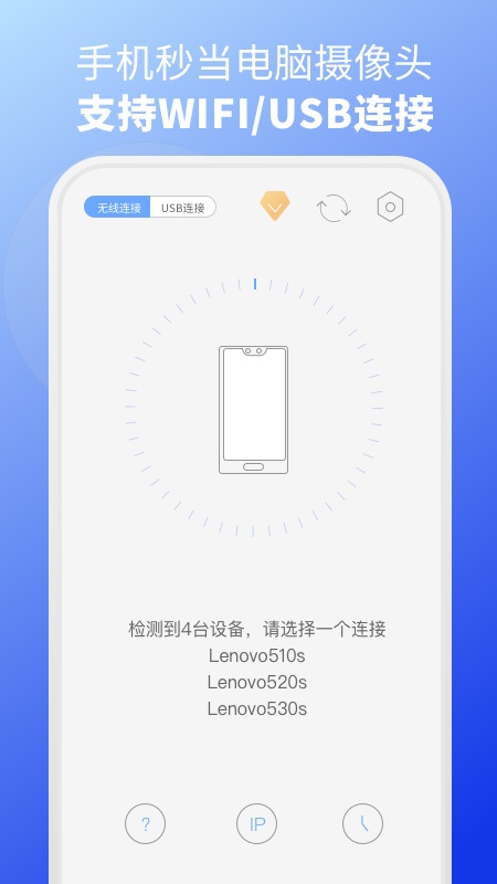 EV虚拟摄像头,让手机秒变电脑高清摄像头和麦克风。支持WIFI / USB多种连接方式,即开即连。超低延迟,高清画面,支持麦克风传输,兼容主流录屏直播软件。手机一键变成电脑摄像头和麦克风虚拟外设。支持手机息屏使用,耗电量更低。 软件功能