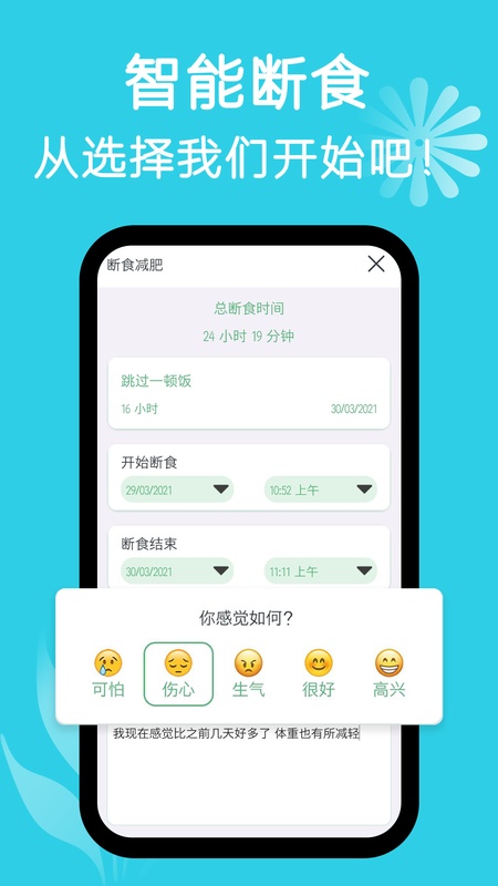 +制定断食的开始时间和结束时间,跟踪您的禁食时间