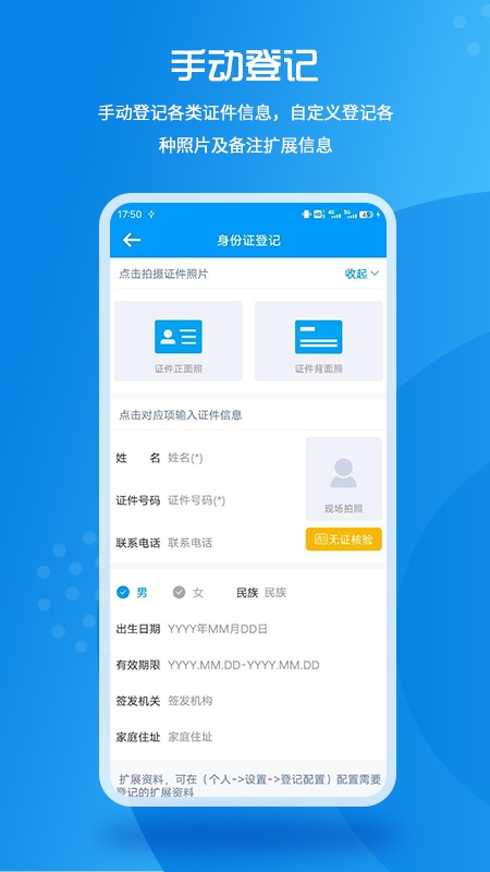 实名登记小助手的特色显著。其支持多种证件识别方式,无论是NFC识别还是相机扫描,都能满足不同场景下的需求。手动登记功能灵活性高,可自定义照片和备注信息,适应多样化的登记要求。数据导出功能方便快捷,能以常见的Excel和PDF格式分享,便于数据的整理和交流。与电脑端的实时同步功能,实现了信息的无缝对接,提高了管理效率。