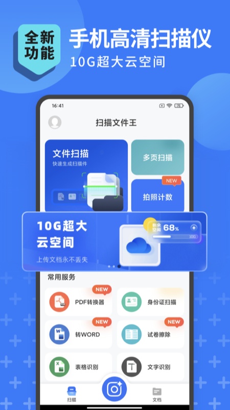 文字识别功能可扫描各种文件、图片等提取文字并编辑、复制;表格识别能精确定位表格数据,智能解析表格文字并生成可编辑的Excel文档;证件识别通过OCR技术自动识别、提取图片文字,免除手动录入烦恼。拍照翻译支持多种语言全文互译,无需额外打开翻译APP。此外,还提供10G云空间,方便扫描文档上传、下载及分类管理。