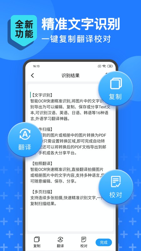 扫描各种文件、图片、书籍、名片等提取想要的文字,可对识别的内容进行编辑、复制;