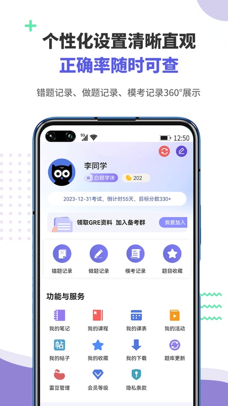 包含gre在线模考真题练习,模拟真实考试场景和时长,结束后出具分数及详细分析报告,智能提供备考攻略;gre在线刷题,涵盖gre全科考点练习,有众多备考资料题库和模考题库;长难句练习全新上线,可自行选择句子难度进行练习;每月不定时开启gre刷题打卡团,有学习小助手监督,专职讲师一对一答疑;自有雷哥社区,可进行题目、做题心得等交流;丰富真题资料免费下载,每日更新考情资讯。
