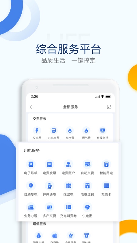 一站式智能交费功能包括智能交费,满足全天候交费需求,提供多种便捷安全的电费支付体验;电子账单可查询每月用电明细,还有趣味账单等新功能;电费发票能在不同业务场景下实现个人、单位和集团内业务电子发票查询以及纸质发票开具;交费服务支持26个省市电费、23个省市水费、14个省市燃气费、5个省市有线电视费交费;业务办理新增电代煤和供暖期阶梯功能。