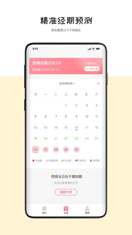 经期提前预警,一次设置长期有效,每日打开APP可查看所处经期阶段,如月经期、易孕期、安全期或排卵日。