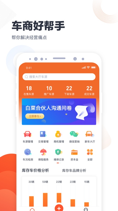 白菜商家版是专注于二手车零售服务的综合性服务APP,面向二手车买家卖家提供服务,涵盖车辆信息查询、车况保障、车辆保险等综合性服务。平台开放数据、技术等资源和能力,聚合并赋能从业者,对交易流程、服务进行规范化和标准化,服务B端、C端以及帮助B去服务C端,旨在建立行业规则和标准,将资源、商户和消费者高效协同起来,用线上技术和数据智能重构交易服务体系。