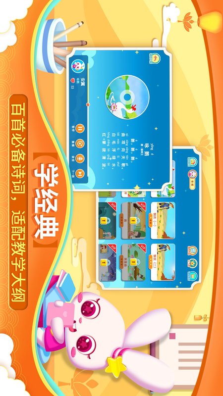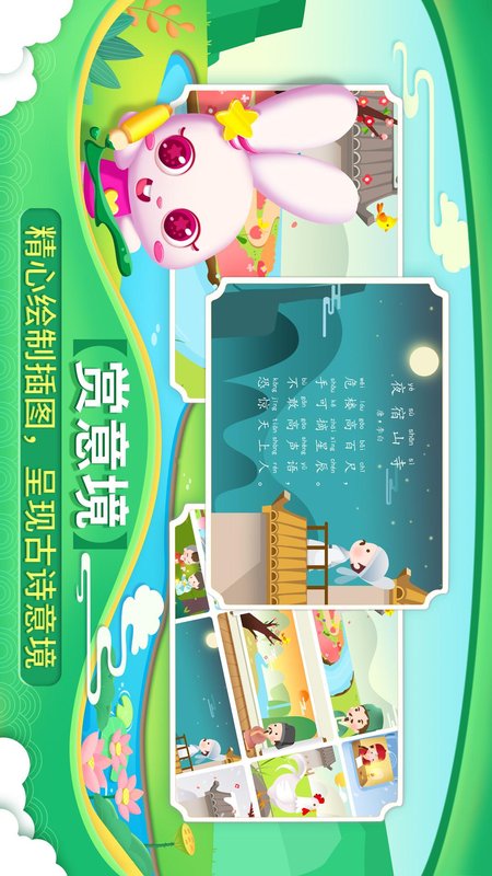 该软件精选100首幼儿必读经典诗词,专为3 - 8岁孩子设计古诗早教课程。具备按小学大纲编排,配合教材同步学的功能,能在学习欣赏古诗时进行幼小衔接。全诗标注精准校对的注音,还配有专业朗读示范,可引导孩子跟读朗诵古诗,同步开展幼儿识字早教。软件有优美的手绘背景,结合古诗意境绘制精美插画,能吸引孩子注意力,培养阅读兴趣,帮助孩子加强对古诗内容的理解和记忆。此外,支持录音上传功能,孩子可上传自己的朗诵作品,和其他小朋友进行点赞互动。