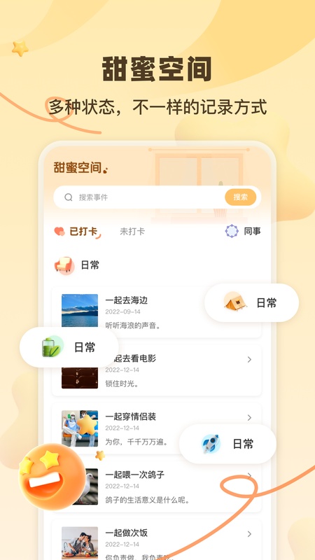 2,甜蜜空间:添加至此的事件可以记录是否打卡,完成事件添加备注图片