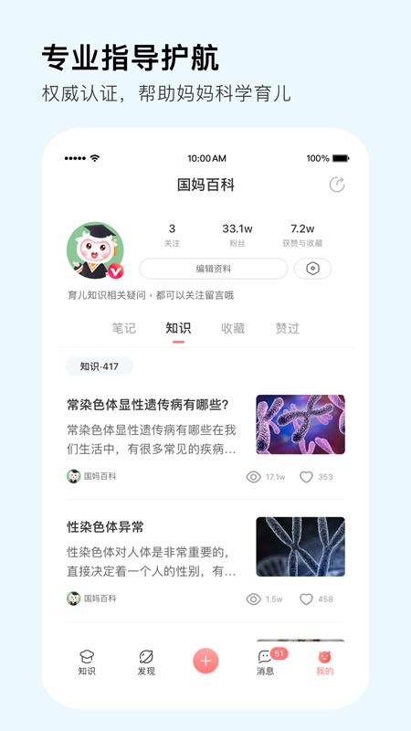 专业的孕育知识:涵盖备孕、怀孕、产后、育儿到亲子早教等阶段,汇集万千妈妈的孕育经验,根据不同阶段推荐所需知识。