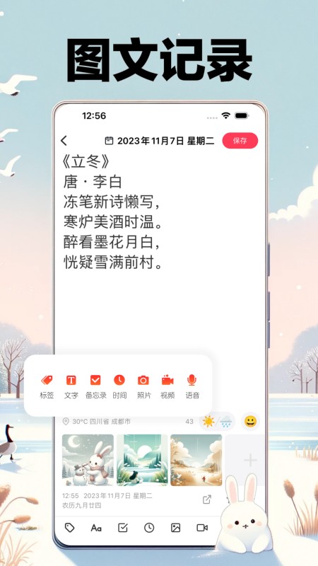 除了普通的日记本功能,还可以添加照片、视频和录音,作为云笔记、手帐、日志和备忘录,或者便签记事本,记录生活的点滴。