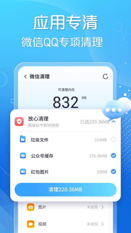 极速清理方面,具备一键清理功能,一键搞定无用垃圾,让手机清理更省心;可进行深度清理,全盘扫描手机储存空间并深度清理垃圾;能瞬间释放手机内存,加速效果超同行;还可有效清理微信里的无用垃圾文件,使手机运行更顺畅。