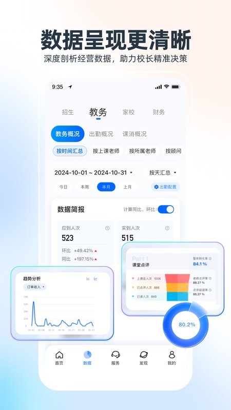 ①教务分析:课消情况、出勤率一目了然,支持导出教师课时汇总数据,工资结算有据可依