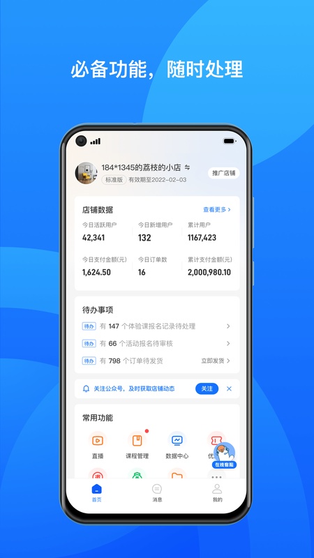 小鹅通商家版APP是一款帮助商家快速创建体验店铺和管理店铺的经营管理工具,随时随地查看店铺经营数据,管理商品、订单、用户和反馈信息。 软件功能