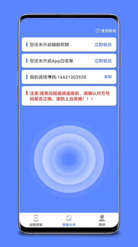 如果要使用远程控制功能,在双方手机上都打开App,建立连接。若要监测小孩和老人手机屏幕,在首页关闭后台任务栏并将对方加入白名单。