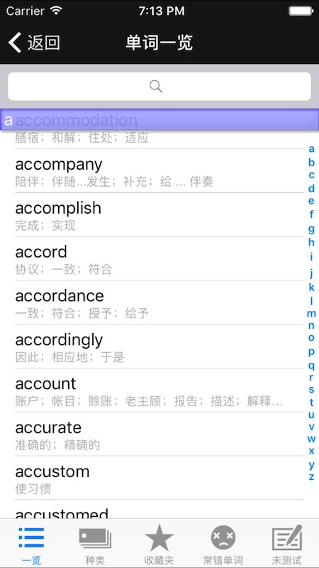 ・测试过程中,所有回答错误的单词会按照日期自动记录在复习列表中,以方便您随时查阅、学习。