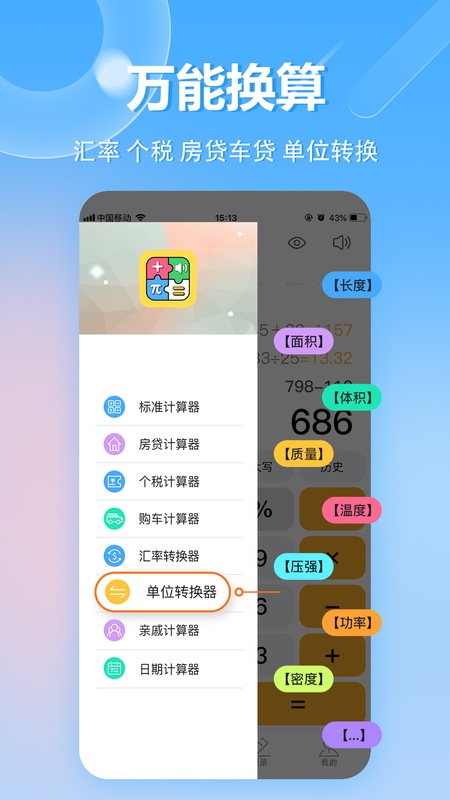 其功能丰富多样,集计算器、科学计算器、分数计算器、汇率换算、个税计算器、房贷计算器、车贷计算器、五险一金、日期计算器、进制转换、理财计算、自定义公式、单位换算、亲戚计算器、日常记账、备忘录等为一体,拥有无限条存储历史记录。