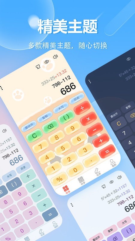 该软件是一款功能强大的超级计算器,新增“趣味数字”有助于提升思维能力。它包含科学计算器、全能语音计算器,能解决计算记账难题。有精美主题可免费切换,还新增了分数计算器。具备历史纪录、语音播报、大写转换、复制结果等功能,可直接显示计算结果,首页能自主选择是否开启计算历史步骤,操作简单方便。