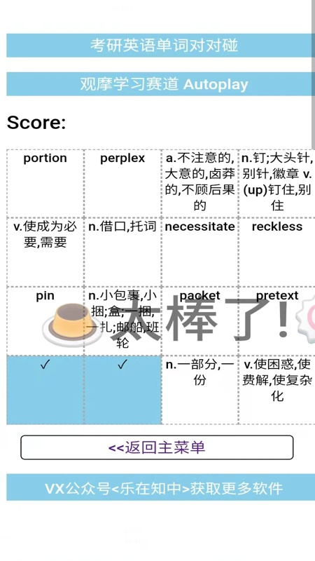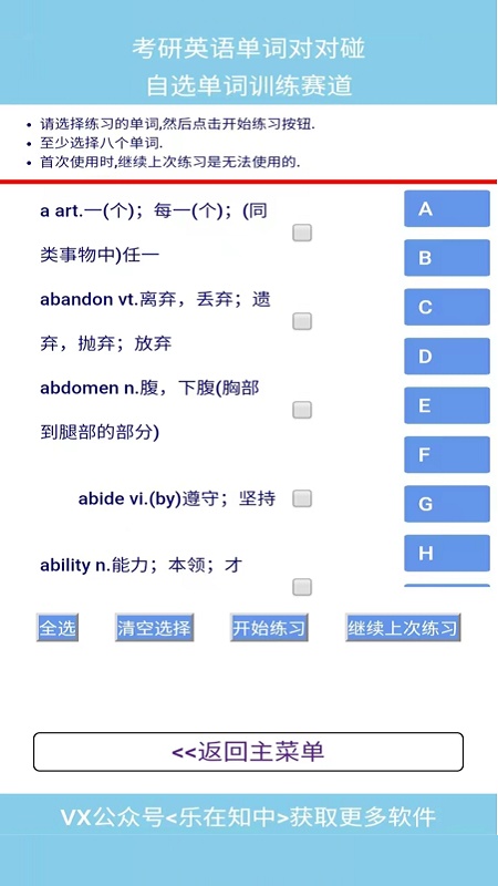 3.考研英语单词对对碰提供了15条单词记忆练习赛道,包括: