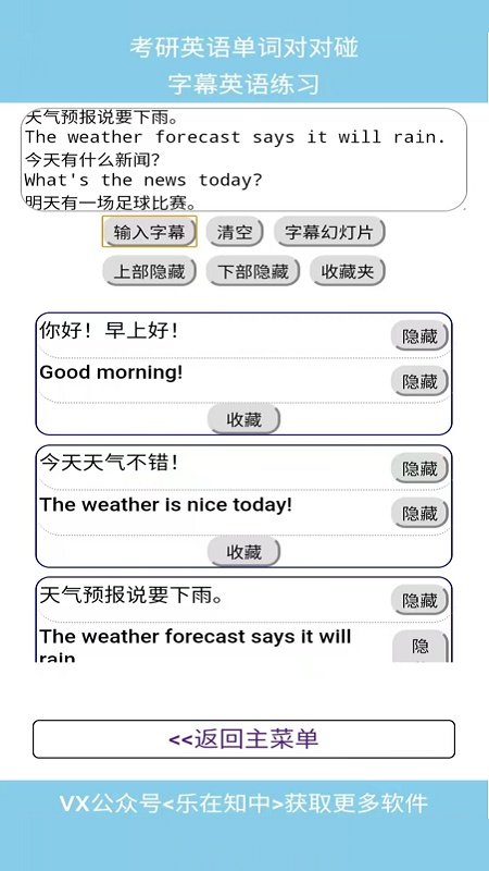 3.字幕英语练习,用户可以自己随意粘贴自己想要练习的中英对照语句,自由进行中英文互译练习和复习,提高自己的英语水平.具体玩法请看视频介绍,相信各位用户会找到更多的玩法.
