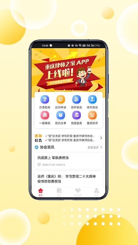 “重庆律师之家”APP为不同类型用户提供个性化服务,包含律协系统各种服务的定制化接入。会员可凭重庆市律师协会网账号密码直接登录,无需注册。还提供律师执业常用专业工具,支持协会活动报名、在线视频培训、一键维权、预约办事、年度考核、费用计算等,且应用功能模块持续增加。