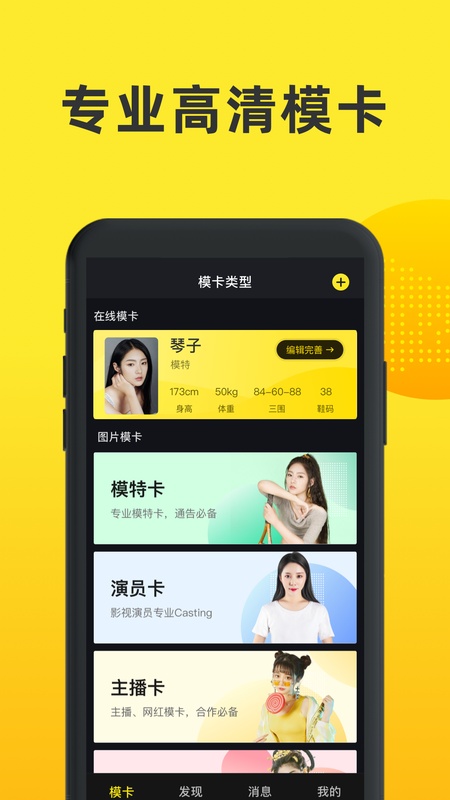 模卡极速版APP具备免费在线制作专业高清模特卡、演员卡、主播卡、主题卡等功能,有几百张模板可供用户任意选择。还能分享优质作品,生成在线模卡名片,且与微信小程序打通,实现快速发送模卡名片。此外,商家、经纪人可以通过该APP在线管理收到的模卡,方便管理艺人。