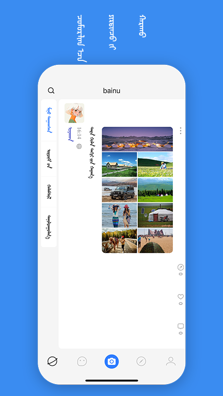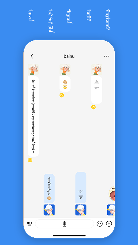 Bainu是一款使用传统蒙文的社交聊天应用。使用Bainu您可以随时随地结交您身边的朋友,并支持一对一和群组聊天。在聊天中您可以发送文字、语音、图片、视频等多种类型的消息,还可将身边的趣事发布到Chomorlig和好友分享。 App 功能
