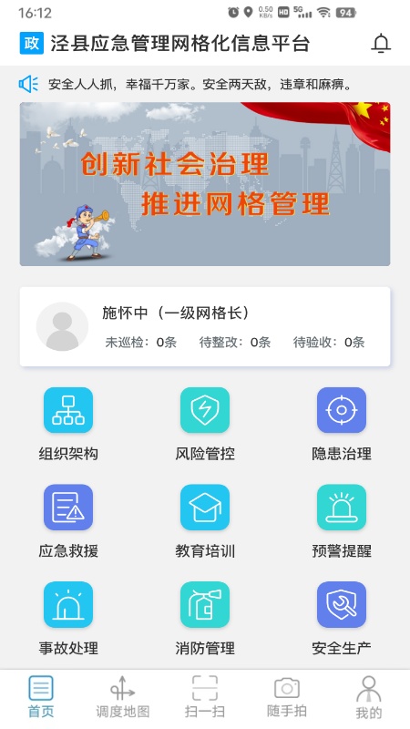 村级以上网格设置以应急管理部门为核心的调度中心,负责应急管理和隐患调度,在电脑端和移动端提供调度地图,展示隐患和风险点动态变化,方便调度员进行催办、干预、调度等操作。