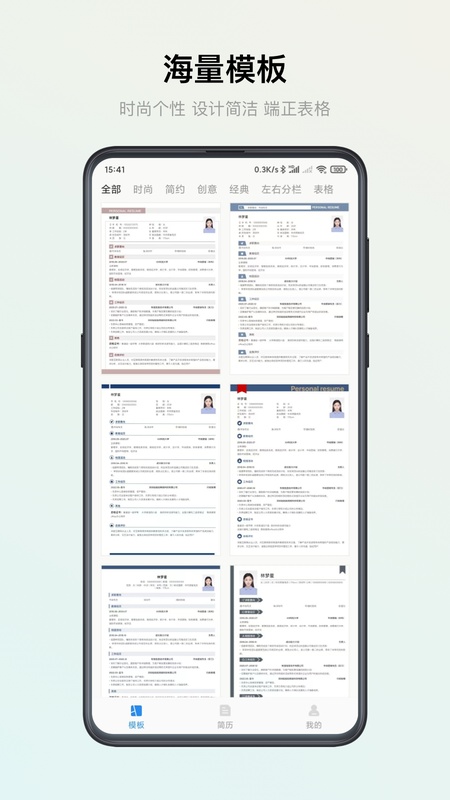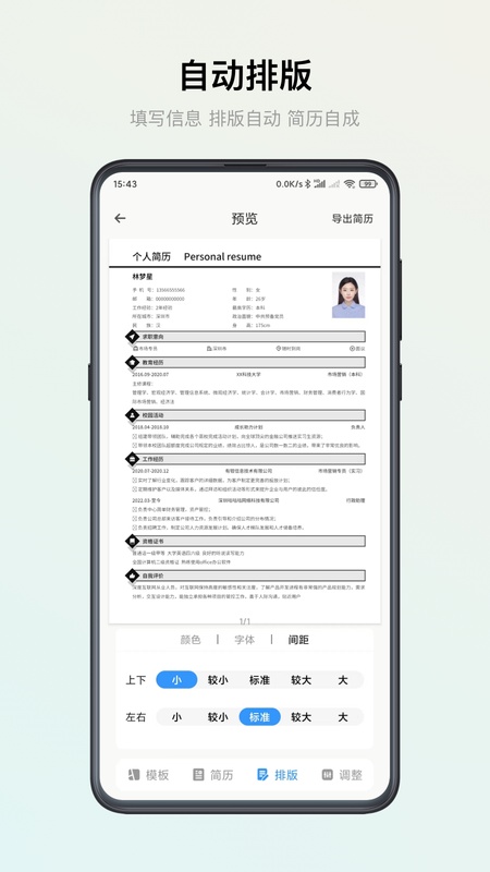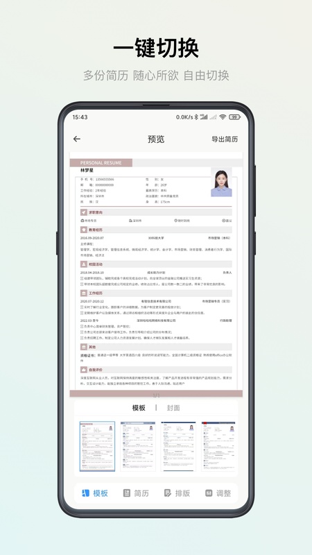 任意模板您都可以进行排版调整,一键生成简洁大方的个人简历。