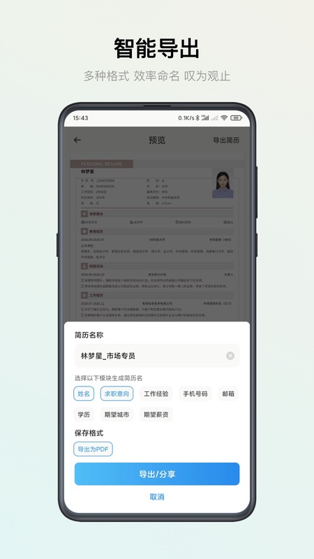 生成简历之后,直接在简历制作器中,一键发送您的简历给HR,快速获得面试邀请。 软件功能
